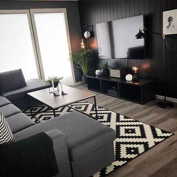 A black accent wall adds drama and sophistication. Complement it with grey furnishings and metallic decor for a high-end look.